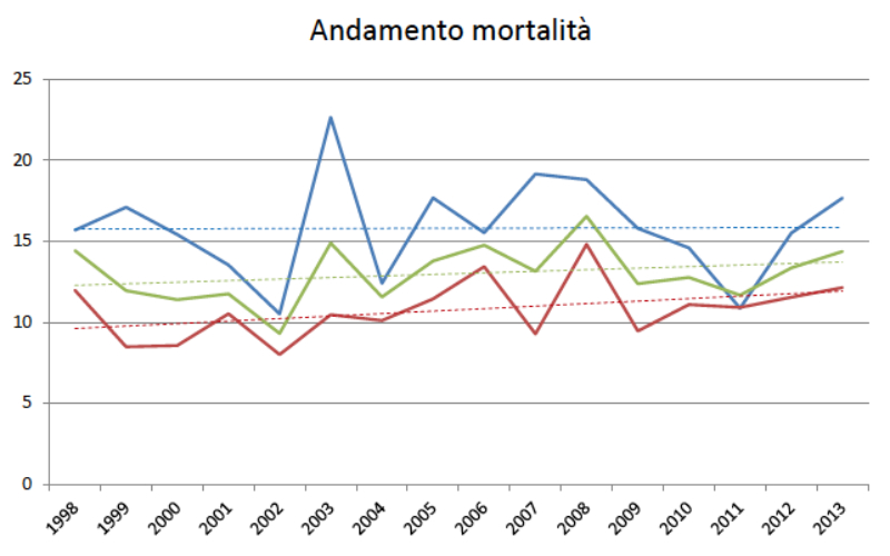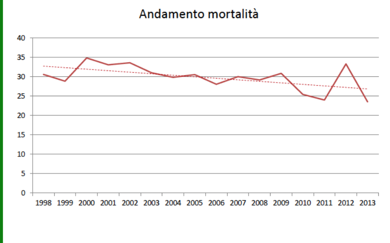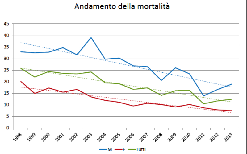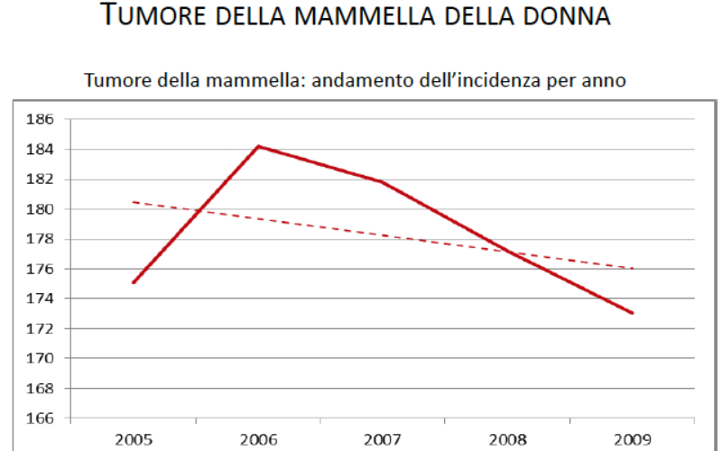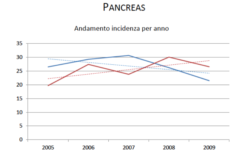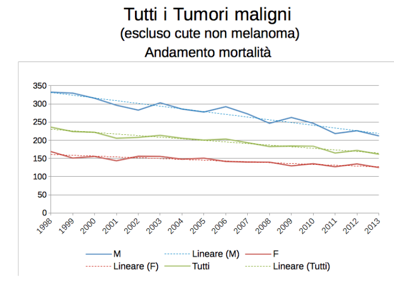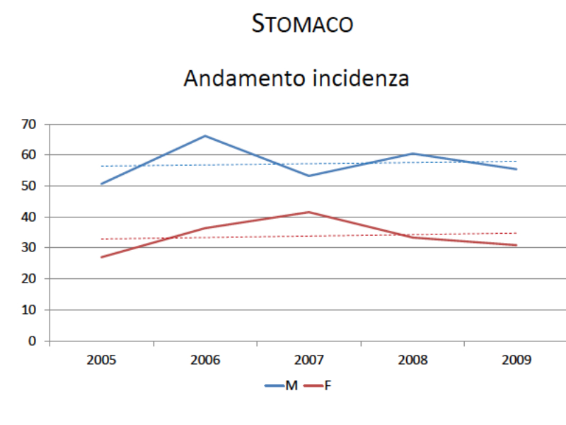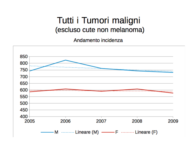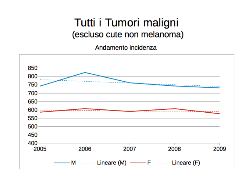 L’incidenza dei tumori in generale è decrescente tra 2005 e 2009, ma più per gli uomini che per le donne; la mortalità decresce anch’essa ma in maniera molto più sensibile tra gli uomini.