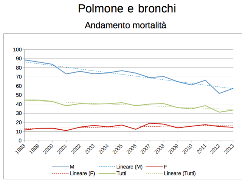 POLMONE E BRONCHI – Le donne hanno preso le cattive abitudini degli uomini, che invece le stanno abbandonando, per quanto riguarda il fumo. Mentre la curva dell’incidenza del tumore ai polmoni è in netta diminuzione tra i primi, è invece in crescita per le seconde: lo stesso andamento si vede anche nella mortalità, in maniera ancora più sensibile, tra 1998 e 2013. “Dove i fattori di rischio sono evidenti e si fa prevenzione – spiega il direttore sanitario dell’Asl, Raffaele Stradoni – si riesce ad incidere positivamemte. La campagna contro il fumo, ad esempio, funziona da diversi anni e sta mostrando risultati. Sul fronte della prevenzione primaria abbiamo intensificato la conoscenza del problema tra i ragazzi in età scolare e tra gli adulti fumatori, anche con visite nelle aziende ed incontri di counseling motivazionale”. La sopravvivenza a 5 anni si sta assestando al 10% tra gli uomini e al 18 tra le donne.