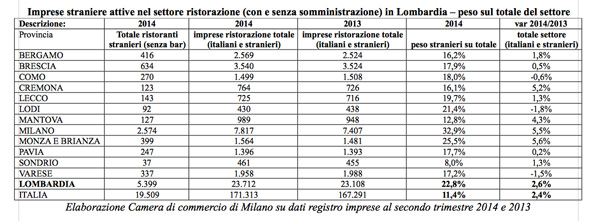 Nella nostra provincia sono 123 i ristoranti gestiti da stranieri, complessivamente il 16,1% del totale (pari a 764), mentre nel 2013 erano 105 su un totale di 726. Dunque, su 38 nuove aperture complessive (con una crescita complessiva della ristorazione pari a 5,2%, decisamente sopra la media italiana e lombarda), nel 2014, circa la metà sono da attribuire a stranieri.