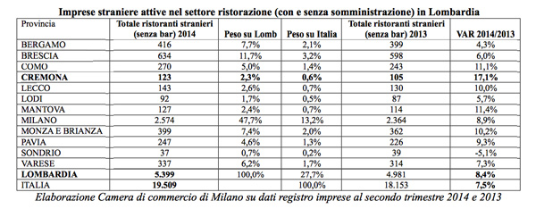 La ristorazione straniera risulta in crescita a Cremona, più che in tutto il resto della Lombardia. Lo evidenziano i dati della Camera di Commercio di Milano, secondo cui i locali stranieri sono in forte aumento in tutta la Lombardia, e a Cremona più che in tutte le altre città, con una variazione, tra 2013 e 2014, del +17,1% .
