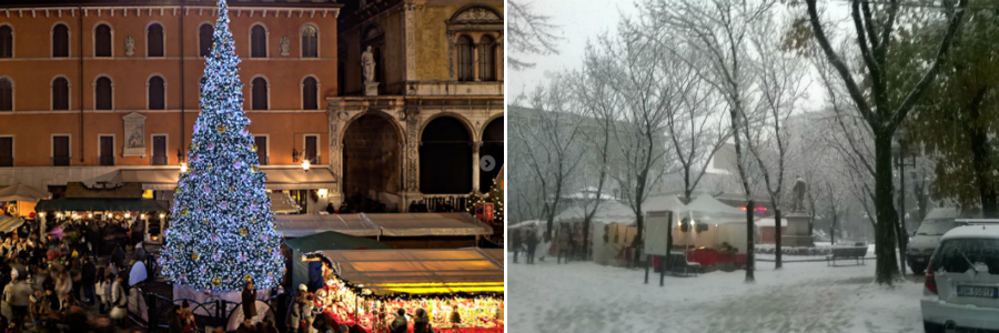 Nella foto, da sinistra: l’albero di Natale allestito in centro a Parma; quello di cortile Federico II a Cremona; i mercatini natalizi di Verona.