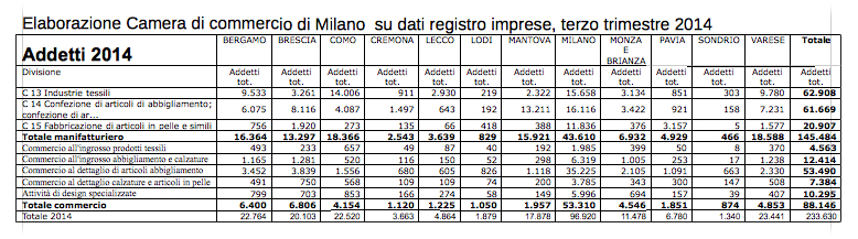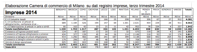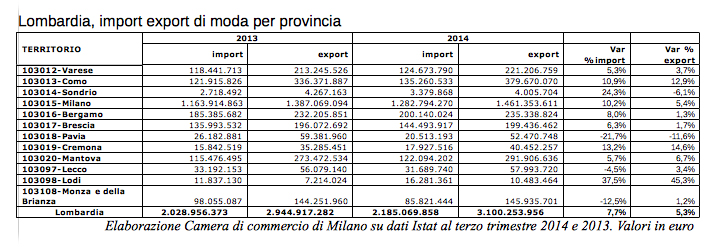 Aumenta sia il valore delle esportazioni che quello delle importazioni nel settore moda della provincia di Cremona. Emerge da un’elaborazione della Camera di commercio di Milano su dati del registro delle imprese al terzo trimestre 2014 e 2013. Nel territorio cremonese export a circa 40,5 milioni di euro nel 2014 (+14,6%) e import a circa 18 milioni (+13,2%). Il numero delle imprese cremonesi al terzo trimestre 2014 è 778 (287 nell’area manifatturiera e 491 in quella del commercio), ancora in calo. Quanto al numero di addetti, 3663 (2543 nell’area manifatturiera e 1120 nel commercio).