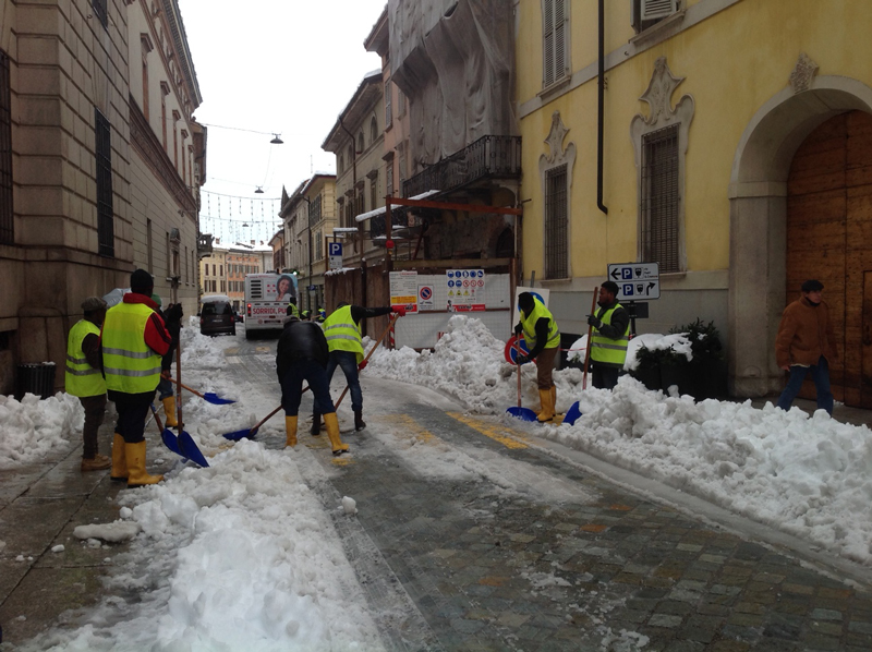AGGIORNAMENTO – Dal caos di venerdì mattina con mezzo metro di neve, piante cadute (e danni ad auto), cavi rotti e penzolanti per strada, utenze domestiche in tilt, disagi sulle linee ferroviarie e autostrada bloccata, al lavoro messo in atto per cercare di ridurre i grossi e numerosi disagi. Ecco una selezione di fotografie che ripercorre una giornata difficile per Cremona e per tutta la provincia (vedi i link in basso). Una giornata iniziata con la decisione di chiudere su invito del Prefetto le scuole sia venerdì che sabato e poi proseguita, fra le altre cose, con la sospensione del mercato di sabato nel centro cittadino e con il contributo di migranti volontari, e anche di minori stranieri non accompagnati, per le operazioni di pulizia dei marciapiedi, in tutto una trentina di persone attivate grazie alla collaborazione fra Comune (settori Welfare, Economato e Polizia locale), Casa dell’accoglienza e Cooperativa Nazareth. Stilato un primo bilancio dei danni al verde pubblico: nei parchi cittadini circa 200 le piante colpite (cadute o danneggiate).