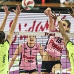 TERZO SET – Urbino prova a vendere cara la pelle e un muro di Walker manda le ospiti sul 3-5. Il pari arriva in un amen e con due ace di Tirozzi le rosa si mettono al volante del set. Gennari in proprio e poi con un mani-fuori del muro marchigiano fa 9-5. Sirressi con una magia toglie il pallone ad un’unghia dal taraflex e lo fa ricomparire oltre la rete: 10-5. Con Tirozzi in battuta Urbino va in tilt e un parziale di 8-0 porta il punteggio sull’11-6. Skorupa accarezza il pallone del 14-7, con il team di De Brandt che non solo cede il passo, ma saluta anche la serie A1 complice il 2-0 di Firenze. Mazzanti inserisce Klimovich, Bianchini, Agrifoglio e Quiligotti. Il vantaggio si ridimensiona: sul 20-16 Mazzanti richiama le sue. Con Novara che batte Modena al tie break e Gennari che mette giù il muro del 25-16 le rosa volano ad un solo punto dal secondo posto. Modena perde 3-2 a Novara e ora il secondo posto a un solo punto.