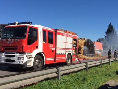 Camion carico di paglia prende fuoco, caos sulla Castelleonese