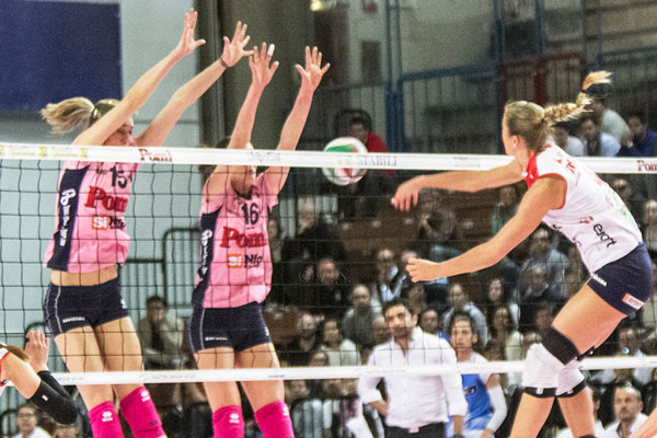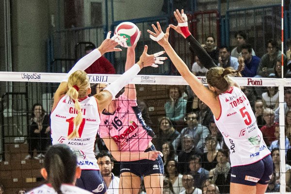 POMI’ CASALMAGGIORE: Ortolani 13, Skorupa 1, Bianchini 2, Sirressi (L), Gennari 8, Gibbemeyer 9, Stevanovich 10, Tirozzi 18. Non entrate: Quiligotti, Agrifoglio, Klimovich. All.: Mazzanti.