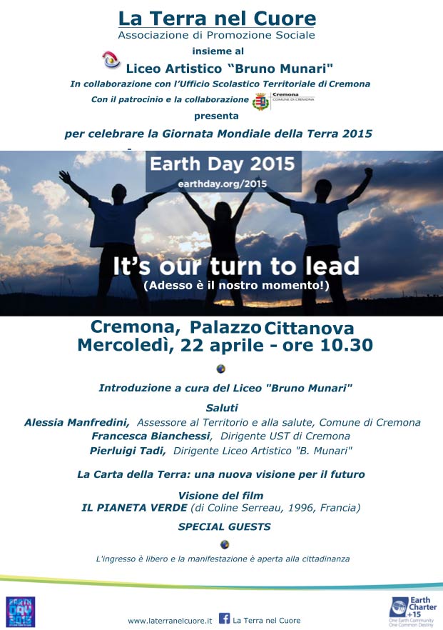 Un evento pubblico a Palazzo Cittanova per celebrare la Giornata Mondiale della Terra. Il 22 aprile dalle 10,30 un incontro, con patrocinio e collaborazione del Comune e dell’Ufficio Scolastico, promosso da “La Terra nel Cuore”, associazione con finalità educative, insieme a Liceo Artistico “Bruno Munari”.