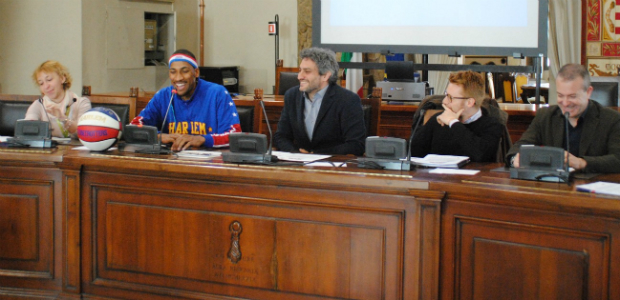 Il giocatore è stato ricevuto in sala Quadri di palazzo Comunale dall’assessore allo Sport Mauro Platé: “E’ un onore per la nostra città ospitare un evento come questo, uno spettacolo che ci piace anche perchè è rivolto a tutta la famiglia. Inoltre gli Harlem uniscono i valori dello sport a quelli della pace e dei diritti umani, sono sicuro che sarà una splendida serata”. A beneficiare in parte dei proventi dello spettacolo sarà la fondazione Candido Cannavò per un progetto di aggregazione scolastica mediante lo sport intitolato Stay@school” a favore di ragazzi disagiati di una scuola superiore milanese. Un paio di anni fa la stessa società ha collaborato anche con l’a.s. Baskin di Cremona. Ad accompagnare Zeus in Comune era presente anche Enrico Ferrari per Shot Events, ex giocatore ed allenatore della pallacanestro Desio, di casa al palazzetto. La città del Torrazzo è stata scelta (insieme a sole altre 7 città dell’Italian Tour) per l’alto livello sportivo della sua squadra di serie A ma anche per il vasto mondo del basket giovanile che sta crescendo di anno in anno.