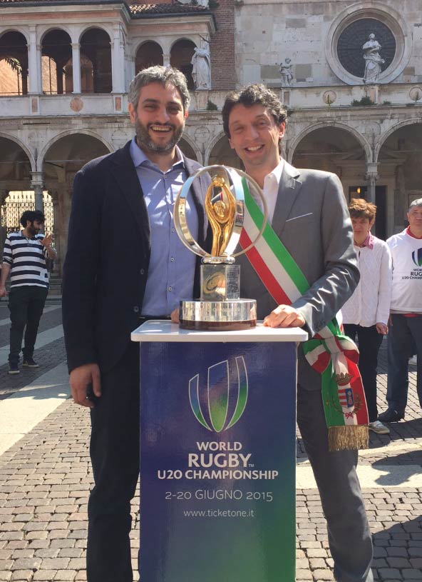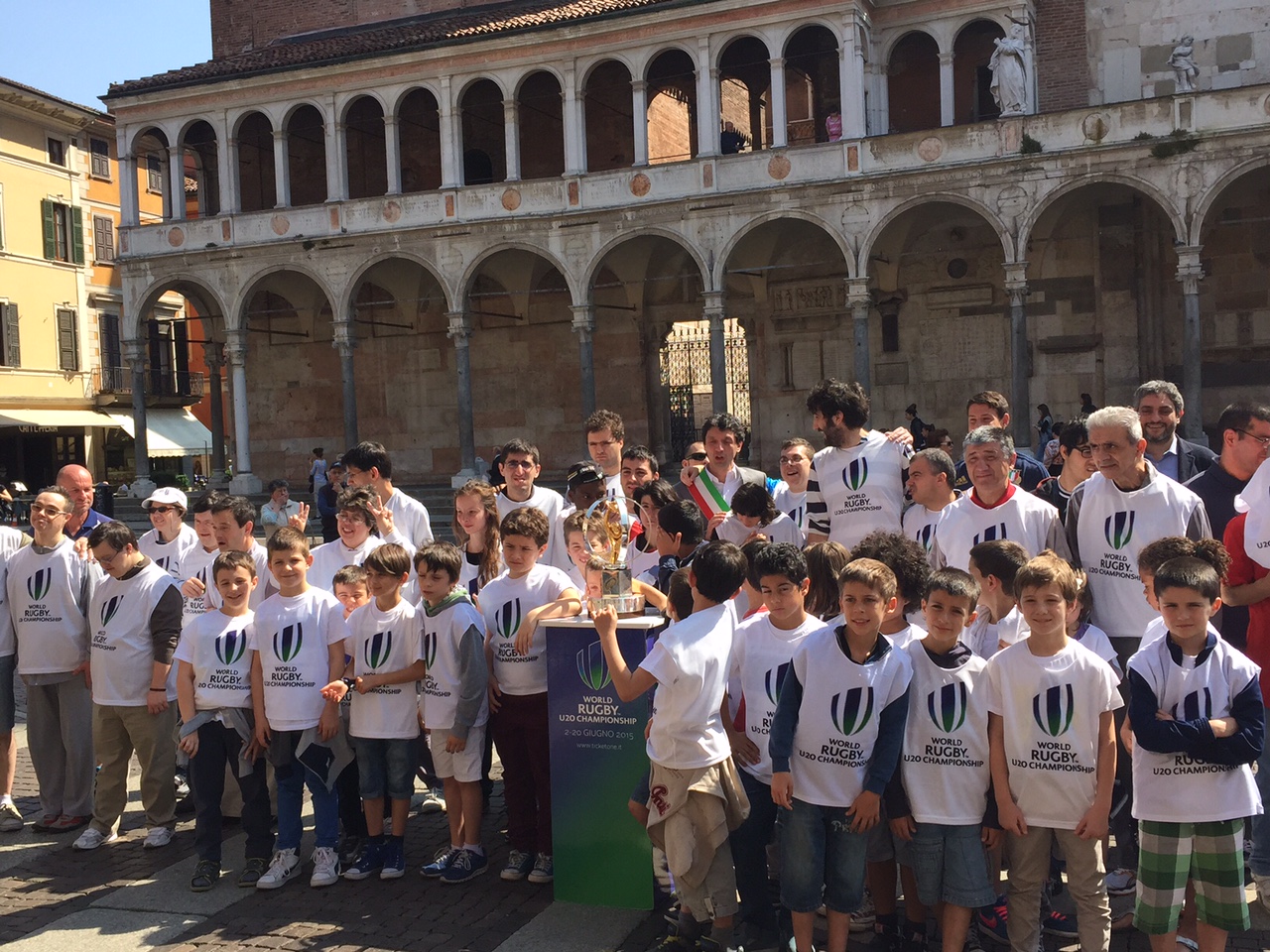Mondiali rugby U20, la coppa arrivata a Cremona con il ritorno di Morisi Trofeo portato in cima al Torrazzo