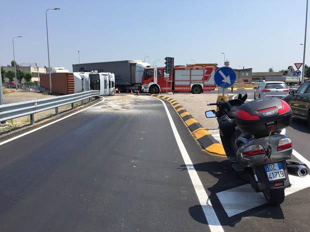 Paura a Cicognolo, proprio sulla rotonda, dove nella tarda mattinata di martedì un tir si è ribaltato. Fortunatamente nessun altro mezzo è stato coinvolto nell’incidente, le cui cause sono ancora in corso di accertamento. Si è temuto invece per l’autista, che però ne è uscito solo con ferite lievi.