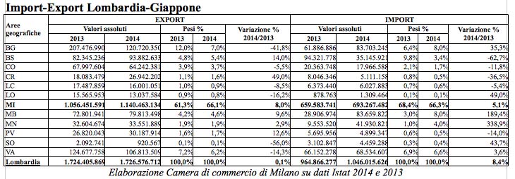 E’ pari a 2,8 miliardi di euro il valore dell’import-export lombardo con il Giappone nel 2014. E Cremona si mette in luce per le esportazioni. Il dato arriva da un’elaborazione dell’ufficio studi della Camera di commercio di Milano su dati Istat 2014 e 2013. Stabili i rapporti commerciali tra il 2014 e il 2013 per le esportazioni, con un giro di affari di 1,7miliardi.