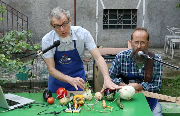 Si possono suonare anche gli ortaggi. La dimostrazione la danno Gian Luigi Carlone, uno dei fondatori della Banda Osiris, e Biagio Bagini, autore di trasmissioni radiofoniche e libri per bambini. Hanno messo in piedi un progetto dal titolo “Conciorto”. I due artisti così descrivo l’iniziativa: “L’orto è lo spazio di riferimento a cui guardano i due suonatori. Perché l’orto è il luogo dove la parola è come un seme. Che poi getta foglioline che sono note. Che poi diventano piante in forma di canzone. Qui crescono canzoni pop, rock e moderne che raccontano i vissuti di melanzane, peperoni e zucchine, e parlano degli stati d’animo dell’orticoltore, oltre a raccontare le storie di orti di personaggi famosi”. Gli ortaggi sono collegati con dei cavi e dei sensori ad un sistema open source che permette di far emettere suoni a qualunque cosa sia in grado di condurre elettricità. Con il semplice tocco degli ortaggi da parte di Carlone si creano suoni con i quali è possibile formare delle vere e proprie canzoni. Insieme a Bagini, che lavora da sempre con le parole, hanno composto i testi che accompagnano le loro musiche. Il risultato è un concerto sostenibile, un vero “live in the garden”.