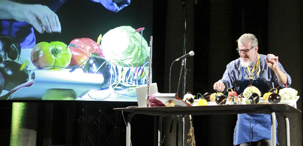 Una serata per omaggiare il ritorno nella sua sede naturale del quadro Scherzo di Ortaggi e riportare l’attenzione dei cremonesi sui capolavori poco conosciuti della Pinacoteca. Ma anche per mostrare che il cortile di palazzo Affaitati può essere qualcosa di più che un luogo di passaggio da una sala lettura all’altra e diventare invece epicentro di cultura e idee. Sul palcoscenico allestito davanti ad un’installazione che riproduce la sagoma del quadro l’Ortolano, si sono succeduti Biagio Bagini e Gian Luigi Carlone (uno dei fondatori della Banda Osiris), che hanno dato vita ad una curiosa sperimentazione musicale basata sulla trasmissione dei suoni attraverso vari ortaggi; e il duo Musica Nuda composto da Petra Magoni (voce) e Ferruccio Spinetti (contrabbasso). Una voce capace di raggiungere tonalità estreme, successivamente affiancata da Frankie Hi-nrg, che alla serata ha dato un ampio contributo. Il duo ha dato vita ad una versione inedita e molto applaudita del brano “Quelli che benpensano”, che nel 2009 aveva dato notorietà al rapper ora naturalizzato cremonese. Il cantante è anche l’ideatore del progetto Artune, sperimentato per la prima volta proprio al Museo Civico per il quadro dell’Arcimboldo, che consente un approccio multisensoriale al celebre quadro, grazie ad una playlist di brani scelti da vari artisti, ascoltabile su Spotify. Un progetto che potrebbe presto essere esportato in altri musei (presente tra il pubblico il direttore della pinacoteca di Bergamo).