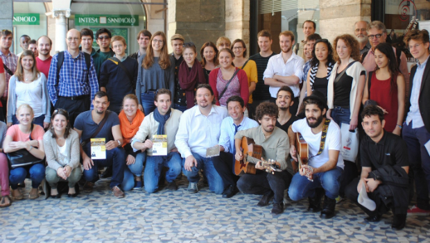 Nella settimana in cui la musica fa da padrona (con STRADIVARIFestival al Museo del Violino e Mondomusica in Fiera) ha preso avvio questa mattina “Suonami, strada che vai pianoforte che trovi”, sotto i portici della Camera di Commercio, davanti alle vetrine del Consorzio Liutai, presenti il sindaco Gianluca Galimberti, l’assessore alla Città vivibile e Rigenerazione Urbana Barbara Manfredini e Lorenzo Biagiarelli & friends. Il Sindaco al pianoforte con Lorenzo Biagiarielli & Friends hanno suonato alcuni pezzi dei Beatles, dando il via in questo modo alla tre giorni di musica in città, davanti ai cittadini e ai musicisti dell’Orchestra Sinfonica Accademica dell’Università di Economia di Vienna che questa sera, alle 21, si esibirà all’Auditorium della Camera di Commercio nell’ambito del Cremona Summer Festival 2015.