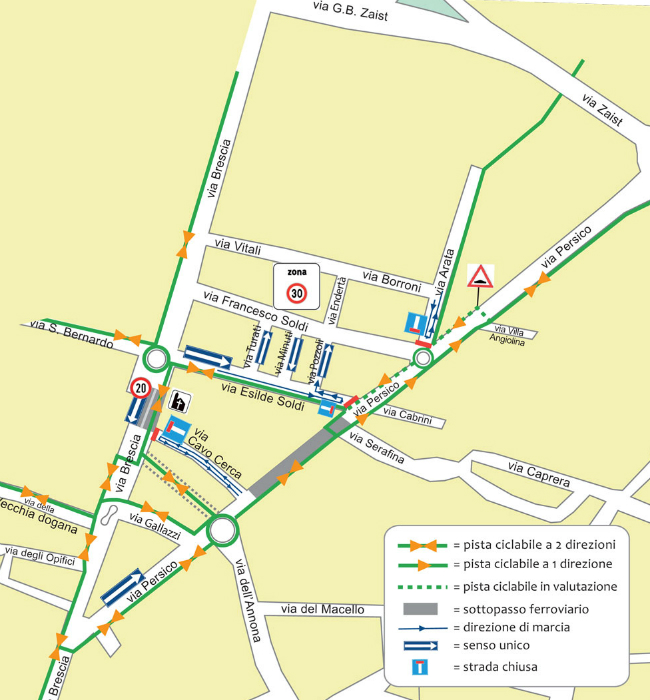 Interventi in via Persico. Sarà istituito il senso unico di marcia in via Persico, nel tratto tra via Brescia e via Gallazzi, con direzione da centro città verso la tangenziale urbana, con contemporanea realizzazione, sempre in questo tratto, di una pista ciclabile bidirezionale posta sul lato sud, a completamento della dorsale già esistente lungo via Persico fino al quartiere Maristella; viene realizzata una pista ciclabile monodirezionale su entrambi i lati (nord e sud) di via Persico, nel tratto compreso tra via Esilde Soldi e via Villa Angiolina; sarà realizzato un dosso rallentatore per favorire l’attraversamento ciclopedonale dei due fronti di via Persico, in corrispondenza dell’intersezione tra via Persico e via Villa Angiolina; si sperimenterà una rotatoria urbana all’incrocio via Persico – via F. Soldi, nell’ambito degli interventi di moderazione della velocità veicolare provenienti dalla tangenziale urbana e della riorganizzazione degli schemi viabilistici del comparto S. Bernardo; nel tratto tra via E. Soldi e via Serafina, il percorso ciclopedonale monodirezionale verso il centro città previsto sul lato nord di via Persico sarà obbligato e vincolato al raggiungimento del lato est della stessa via Persico (e da qui al centro cittadino) solamente per il transito lungo la passerella posta all’altezza di via Serafina realizzata contestualmente al sottopasso ferroviario. Saranno eliminati gli attraversamenti ciclopedonali a raso lungo via Persico (ad eccezione di quello in corrispondenza del dosso rallentatore nei pressi di via Villa Angiolina e nei pressi della rotatoria urbana all’incrocio via Persico – via F. Soldi).