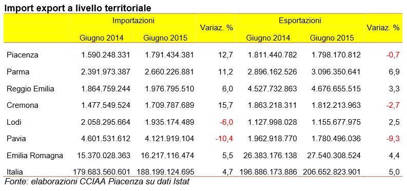 Se a fine giugno 2014 le merci esportate avevano totalizzato il valore di 1.863 milioni di euro, al 30 giugno 2015 il complesso ha raggiunto i 1.812 milioni di euro. Tra le province vicine Parma, Reggio Emilia e Lodi hanno visto una crescita dell’export tra il 6,9% e il 2,5%, a differenza di Pavia,-9,3%, e Piacenza, -0,7%. In Italia incremento medio del 5%. I numeri arrivano da un’elaborazione della Camera di commercio piacentina. Per la provincia cremonese il discorso si ribalta se si osservano le impostazioni: +15,7%.