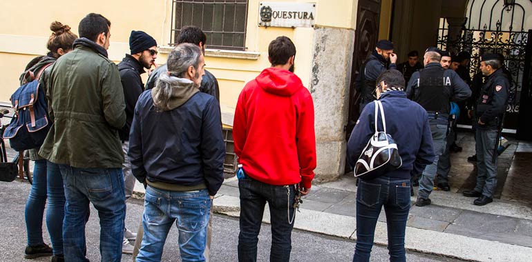 Un gruppo di membri dei centri sociali radunati davanti alla Questura (Foto Sessa)