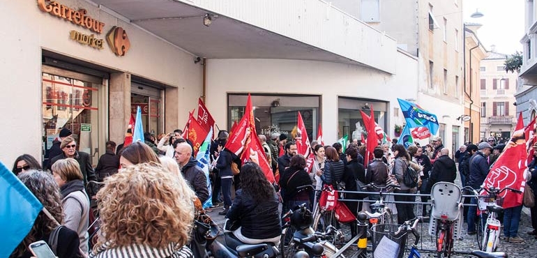 Protesta del mondo sindacale cremonese (Cgil, Cisl e Uil), schierato davanti al Carrefour di piazza Lodi contro il mancato rinnovo del Ccnl del terziario. “Filcams, Fisascat e Uiltucs chiedono con questa manifestazione “di procedere velocemente al rinnovo, anche in considerazione dell’avvenuto rinnovo del Ccnl del terziario distribuzione e servizi, che ha riconosciuto un aumento di 85 euro”. Lo sciopero riguarda tutti i lavoratori dei supermercati.