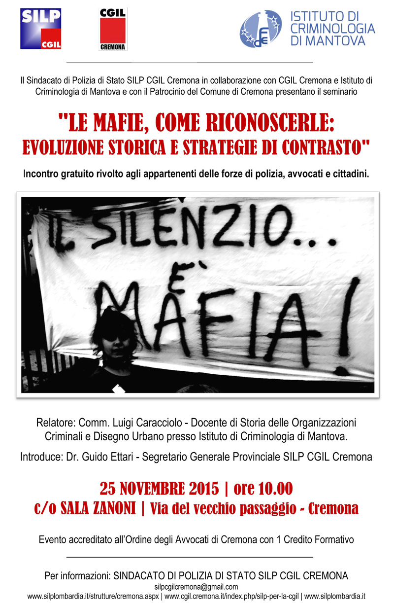 Il sindacato di polizia Silp Cgil, con l’obiettivo di “formare gli appartenenti alle forze di polizia, ma anche avvocati e cittadini” e “per una maggiore conoscenza della criminalità come fenomeno antisociale e dannoso per il tessuto della civile convivenza”, promuove un seminario gratuito dal titolo “Le mafie, come riconoscerle: evoluzione storica e strategie di contrasto”. Il relatore sarà l’ex commissario di polizia Luigi Caracciolo, oggi docente di Criminologia e Disegno urbano all’Istituto di criminologia di Mantova. L’appuntamento, organizzato in collaborazione con l’Istituto di criminologia e con il patrocinio del Comune di Cremona, è in programma il 25 novembre, alle 10, nella Sala Zanoni di Cremona, in via del Vecchio passeggio. Introdurrà l’evento Guido Ettari, segretario generale provinciale Silp Cgil Cremona.
