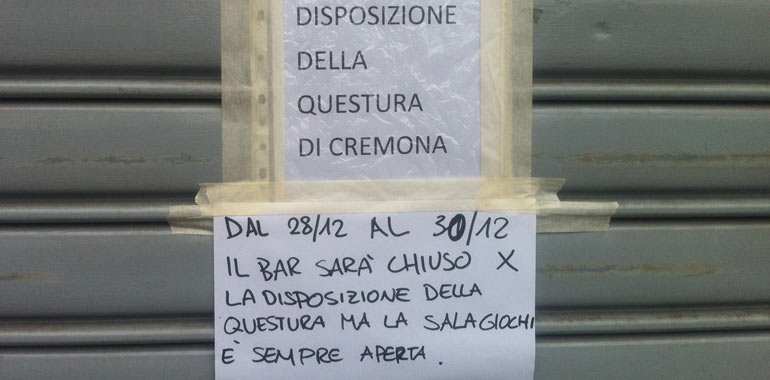 Bar chiuso per tre giorni per rissa. E’ la decisione presa dal questore di Cremona per il bar Bonis di via Palestro, chiuso dal 28 al 30 dicembre per una rissa scoppiata il 24 novembre scorso nel noto locale tra una decina di persone, tra albanesi e tunisini, a causa di birre non pagate. Il provvedimento è stato adottato solo per il bar, mentre la sala giochi è rimasta aperta.