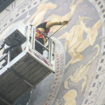 La gru utilizzata da Eurotecno è attualmente la più alta a disposizione della ditta cremonese, relativamente maneggevole anche per per quanto riguarda il trasporto, a differenza di quella da 75 metri massimo, utilizzata qualche tempo fa per dipingere il ponte sul tratto autostradale Cremona – Brescia. Come spiega la titolare di Eurotecno, “siamo particolarmente orgogliosi di poter operare nella nostra città”. Per i cremonesi, una rara occasione di vedere da vicino, appoggiati sul selciato della piazza, le parti meccaniche di un capolavoro dell’artigianato locale.