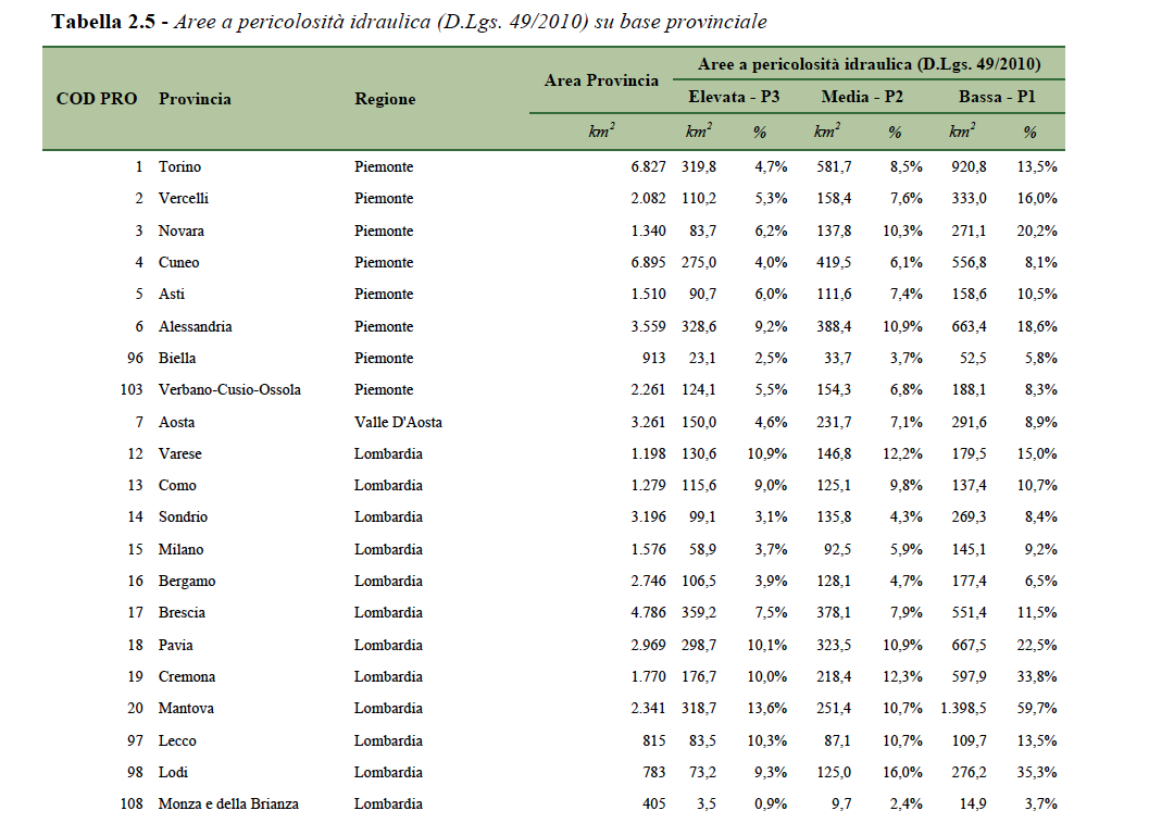 Le Regioni con i valori più elevati di superficie a pericolosità idraulica media P2 sono Emilia-Romagna, Toscana, Lombardia, Piemonte e Veneto. La notevole estensione delle aree a pericolosità idraulica media in Regione Emilia-Romagna è legata, oltre che al reticolo idrografico principale e secondario naturale, anche alla fitta rete di canali artificiali di bonifica.