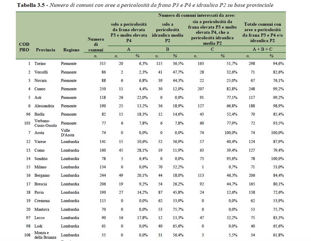 Il maltempo di questi giorni e i danni da esso provocati riporta l’attenzione sul tema del rischio idrogeologico, soprattutto a fronte dei preoccupanti dati emersi dal Rapporto Ispra Dissesto Idrogeologico, pubblicato nei giorni scorsi. I numeri, per il nostro territorio, sono tutt’altro che positivi: oltre la metà dei comuni (62 in tutto), infatti, sono soggetti al rischio, per un totale di 53,9% della provincia (VEDI TABELLA).