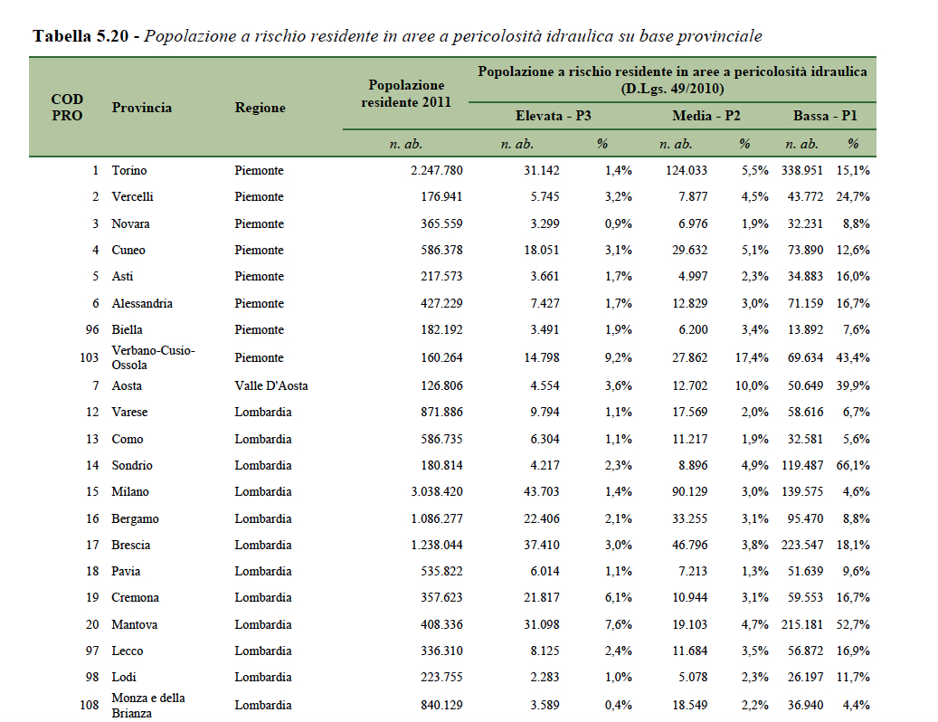 La popolazione residente esposta a rischio alluvioni in Italia è pari a: 1.915.236 abitanti (3,2%) nello scenario di pericolosità idraulica elevata P3 (tempo di ritorno fra 20 e 50 anni); 5.922.922 abitanti (10%) nello scenario di pericolosità media P2 (tempo di ritorno fra 100 e 200 anni) e 9.039.990 abitanti (15,2%) nello scenario P1 (scarsa probabilità di alluvioni o scenari di eventi estremi).