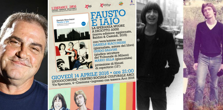 La vicenda del duplice omicidio di Fausto e Iaio, avvenuto nel 1978 a Milano, sarà approfondita durante un incontro che si terrà giovedì 14 aprile alle ore 21:00 presso Luogocomune – Centro Sociale Culturale Arci, a Cremona (Via Speciano, 4, ingresso con tessera Arci 2016). Saranno presenti il giornalista e scrittore Daniele Biacchessi, autore del libro, il giudice istruttore del Tribunale di Milano Guido Salvini, che ha condotto le indagini sull’omicidio e Mario Silla, giornalista che al tempo lavorò a un’inchiesta sulla pista cremonese. Durante la serata saranno proiettati alcuni brevi filmati d’epoca. L’incontro fa parte della rassegna Liberarci. Giovani Memorie Resistenti. Una memoria attiva per la Pace contro la guerra ed è promosso da Arci Cremona, Circolo Arcipelago e Arci Book Lombardia.