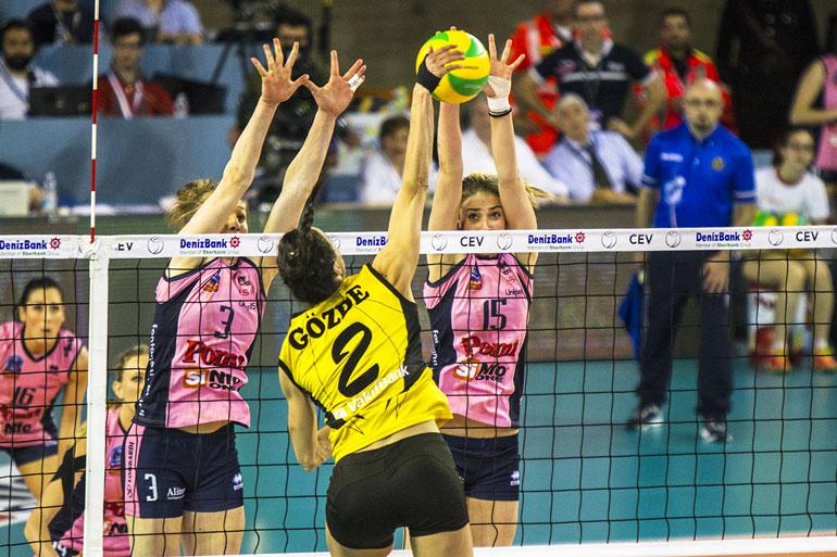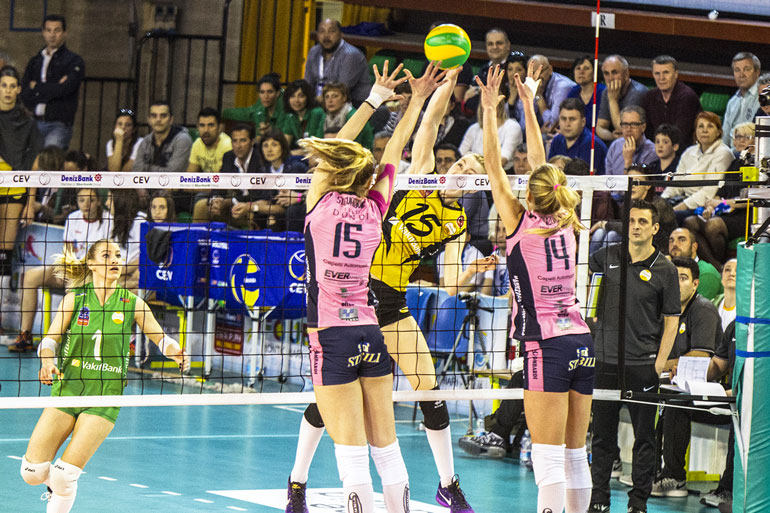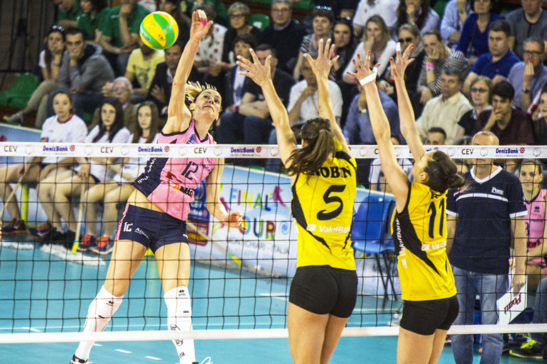 Kozuch e Stevanovic a muro lanciano subito le rosa e ogni punto è un boato che sembra ripreso da uno stadio di calcio dopo un gol. Favorito dal pronostico, il VakifBank Istanbul (due Champions delle ultime cinque) è costretto al punto a punto quando Piccinini attacca con intelligenza e Gibbemeyer mette un gran muro: 8-7 per le turche.