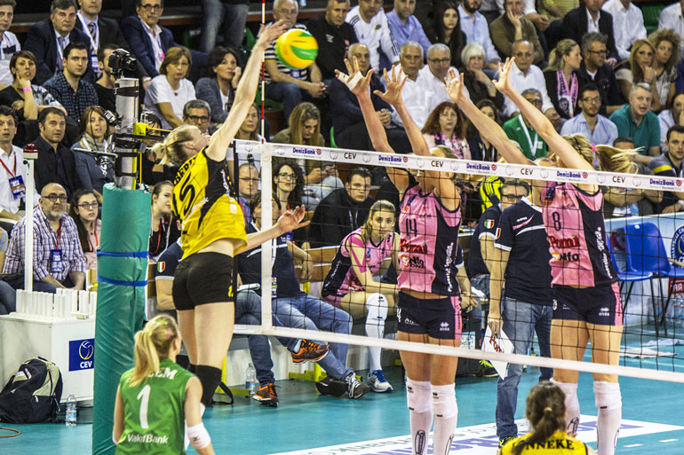 TERZO SET – Il VakifBank è descritto come una squadra dal grande cuore, ma in quanto a cuore la Pomì non scherza e ricuce sul primo momento di incertezza originato dal muro turco che si alza con più costanza. Alla pausa tecnica è ancora vantaggio rosa. Anche perché la squadra di Guidetti non sembra esattamente in giornata di grazia e infatti regala qualche errore banale: 13-10 quando Jovana Stevanovic continua a martellare le sicurezze del team della Mezzaluna. Qualcuno inizia a chiedersi se sia tutto vero, ed è una domanda lecita più che retorica… Tirozzi risponde chiudendo uno scambio infinito e Piccinini zittisce anche le giuste proteste di Barbolini per un tocco sporco del VakifBank: 15-12. Lloyd è ispirata, Piccinini così non s’era mai vista a Casalmaggiore e il +3 resta lì. Sloetjes “sbadila” fuori il 17-14 e il video-check chiarisce che non c’è tocco. La squadra di Guidetti non vuole mollare e resta incollata a Casalmaggiore, ma l’errore di Hill mette nuovamente tre lunghezze tra la Pomì e il VakifBank. Sirressi mette un salvataggio metafisico tra sé e la rimonta turca, 22-20 sull’errore in palleggio delle turche, ma il muro di Kirdar su Stevanovic vale il pari temuto a 22. Se serve una certezza, Lloyd va sempre su Piccinini: 23-22. Stevanovic a muro realizza la leggenda forse più grande della storia dello sport. La Pomì Casalmaggiore è campione d’Europa.
