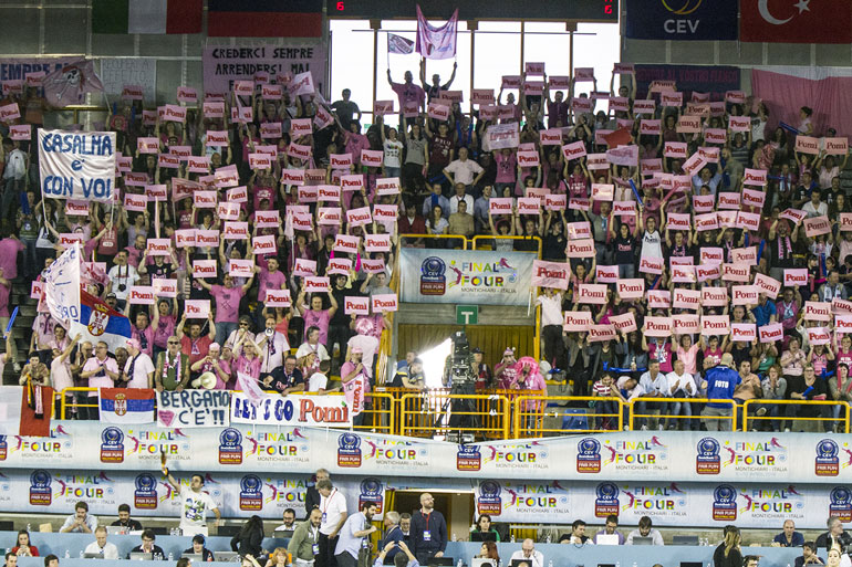 Nella ripresa le turche si impongono, cercano di conquistare punti e distanziare le casalasche, le quali però recuperano in fretta, e di nuovo il set si ripropone come i due precedenti, con uno stillicidio punto su punto, che lascia tutto il tifo con il fiato sospeso. Anche se, dopo il risultato dei primi due set, l’entusiasmo è davvero a mille e i cori non finiscono mai. Si arriva ai punti finali ed è di nuovo un testa a testa che tiene la tensione alle stelle. Le turche non si arrendono e lottano senza risparmiarsi. Ma la Pomì non rinuncia a stupire e a far sognare: con 25 a 22 batte le avversarie e si laurea campione d’Europa.