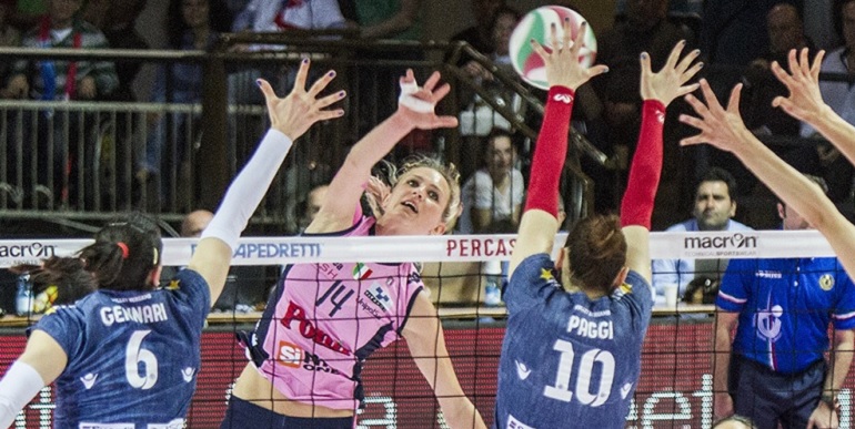 SECONDO SET – Bergamo allunga anche in avvio di secondo set grazie a una scatenato Aelbrecht, che sulle fast fa quello che vuole, e all’ace di Plak, Tirozzi col mancino interrompe l’emorragia: 5-3. Kozuch dalla seconda linea prova ancora ad arginare la Foppa, che è comunque sempre a distanza di sicurezza e trova anche in Paggi, oltre a Gennari, un terminale sicuro. Nel mentre Bacchi entra per fare rifiatare Piccinini, poco precisa in attacco (23%). Quando Bergamo sbaglia, Aelbrecht rimedia, murando proprio la numero 1 casalese e Bergamo torna a +4. Ma è una Pomì che, per il momento, si regge soprattutto su qualche errore avversario e non convince. Gennari in diagonale fa 16-10 e Barbolini chiama il time out per cambiare i connotati a una partita che appare già segnata. Kozuch prova a rianimare la Pomì che però è sempre sotto di cinque e non trova il break che potrebbe riaprire set e partita. Sul 20-14 Lloyd discute animatamente con Barbolini, segno che la squadra non è tranquillissima. Sul 22-15 con Barun, torna in campo Piccinini ma l’andazzo non cambia e Bergamo prende anche il secondo set. Gli arbitri non si capiscono ma il 25-15, pur con ritardo, arriva.
