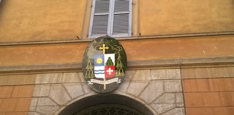 Sul portone della Curia lo stemma del vescovo: 'Servire domino in laetitia'