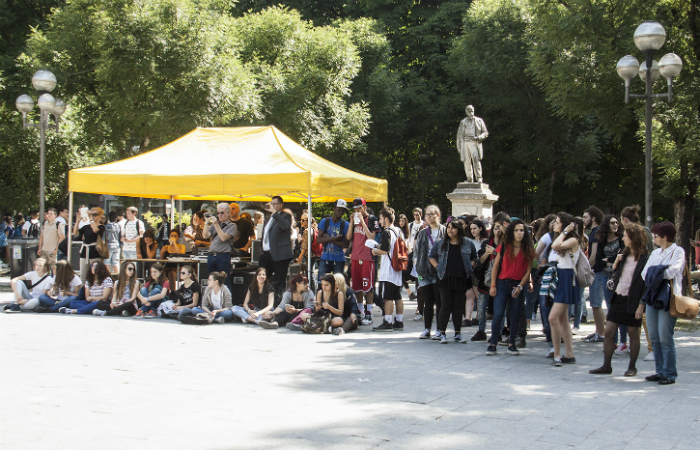 Arrivati ormai agli sgoccioli delle lezioni, ma non di verifiche e interrogazioni, gli studenti delle scuole superiori si sono dati appuntamento questa mattina per la Festa delle Arti, in corso tra piazza Roma e piazza Stradivari. Organizzata come sempre dalla Consulta provinciale degli studenti, la festa è un momento di aggregazione e conoscenza reciproca, un mettere alla prova i propri talenti, che la routine scolastica non riesce a fare emergere. Musica a tutto volume dal palco dei Giardini pubblici dove si alternano varie band, tra gli stand del Centro fumetto Andrea Pazienza, dell’Arci (Circolo Arcipelago e Arcigay) ed esposizioni artistiche di Ludovico Miragoli e Deborah Cortellazzi. Inoltre: libera creatività attraverso parkour e graffiti. Presenti anche i ragazzi del Collettivo autonomo studentesco (qualche problema ieri al Liceo Artistico con il preside).