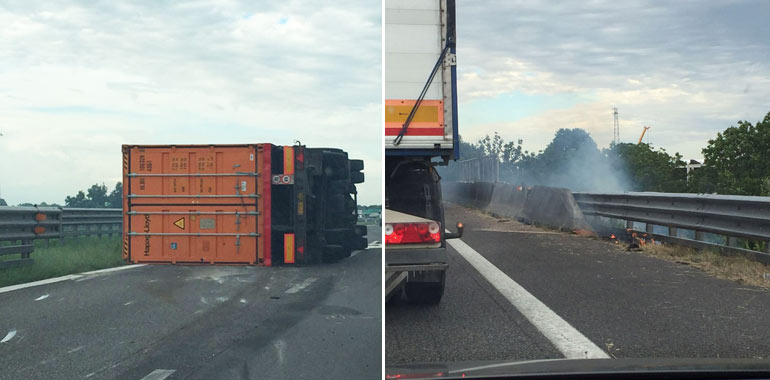 Camion ribaltato e incendio in autostrada nel tardo pomeriggio di mercoledì. Un mezzo pesante si è rovesciato nei pressi del casello di Castelvetro, in direzione Cremona, attorno alle 18,30. Ferite per il conducente, carburante sull’asfalto e sterpaglie in fiamme sul lato della carreggiata dopo l’incidente. Allertati soccorso medico e vigili del fuoco. Polizia stradale chiamata all’intervento per fare chiarezza sulla dinamica dell’accaduto e regolare il traffico autostradale.