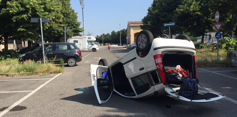 Altra auto ribaltata in città, utilitaria si rovescia al Foro Boario