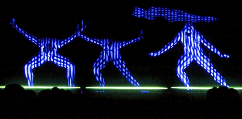Erano otto gli artisti della compagnia con il coreografo Anthony Heinl, eppure sembravano sdoppiarsi fino a fondersi con la scena grazie alla tecnica del ‘Light Wall’. I ballerini hanno volteggiato sul palco e si sono lanciati in performance aeree, ora con illusioni ottiche ora con ombre cromatiche, in sincronismo perfetto fra loro e con la musica. Il pubblico si è fatto avvolgere dal buio in cortile -accompagnato fra l’altro da qualche stella cadente- per apprezzare il telo nero davanti al palco che si è trasformato in un murale scritto dalla luce.