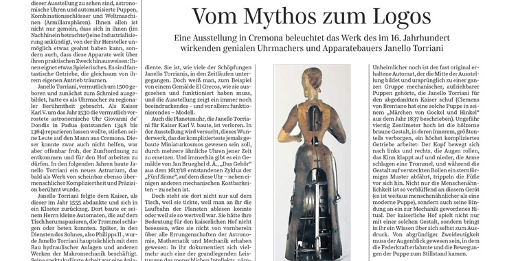 “Un errore comune fa coincidere l’inizio dell’industrializzazione con la nascita della macchina a vapore… Ma l’affermazione è vera a metà, perché l’industrializzazione comincia molto prima, con la trasmissione… L’orologeria è la figura che sta all’inizio storico di industrializzazione, e non solo perché crea strumenti per tempo e misurazione, ma anche perché rappresenta l’evoluzione della trasmissione”. Inizia così l’articolo di Thomas Steinfeld, dal titolo Dal mito al logos, pubblicato oggi sulla Sdüdeutsche Zeitung uno dei più importanti quotidiani tedeschi, dedicato alla mostra Janello Torriani: Genio del Rinascimento, in corso al Museo del Violino di Cremona.