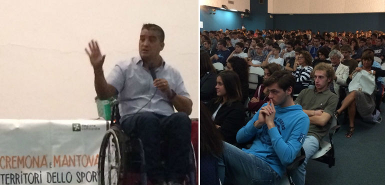 Nell’ambito delle numerose iniziative a corollario del progetto ExSportAbile, del quale il Comune di Cremona è capofila e che mette in rete numerose realtà della province di Cremona e Mantova attive nel mondo dello sport di base, dell’integrazione e dell’educazione, Alessio Tavecchio, già atleta paralimpico e testimonial di numerosi eventi dedicati alla sicurezza stradale, ha incontrato dapprima 400 ragazzi dell’Istituto Tecnico di Istruzione Superiore Torriani e poi 200 studenti dell’Istituto di Istruzione Superiore “Arcangelo Ghisleri”. A lui il compito di fornire ai giovani, che frequentano gli ultimi due anni di queste scuole, preziosi consigli su corretti stili di vita alla guida in auto e con le due ruote.