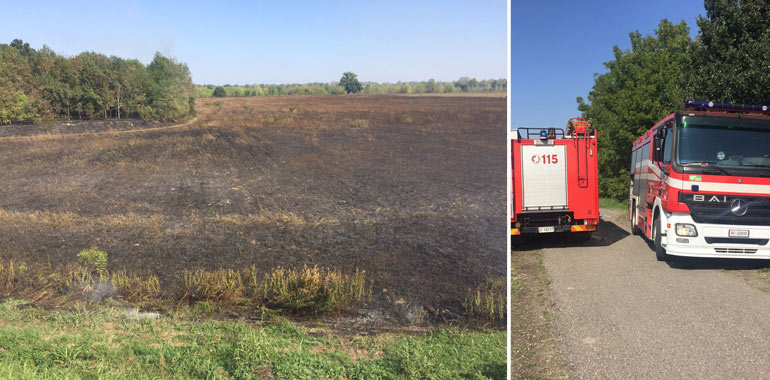 AGGIORNAMENTO – Un grosso incendio ha reso necessario l’intervento dei vigili del fuoco di Cremona e di Piacenza, intervenuta con la squadra di Fiorenzuola, a Castelvetro. Le fiamme si sono sviluppate in un campo non coltivato da alcuni anni, nei pressi del Secondo Baracchino e hanno lambito il vicino bosco. In fiamme anche alcune balle di fieno che si trovavano nell’area. Il bilancio a fine intervento è di un ettaro e mezzo di campo bruciato e di un ettaro e mezzo di sottobosco. I vigili del fuoco hanno lavorato in tarda mattinata e nel primo pomeriggio per spegnere il fuoco e mettere in sicurezza la zona. Non accertata l’origine dolosa dell’incendio; si pensa a cause accidentali, alimentate anche dalla secchezza del terreno.