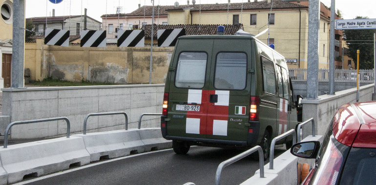 Ambulanza dell'esercito rischia di restare bloccata nel sottopasso di v.Brescia
