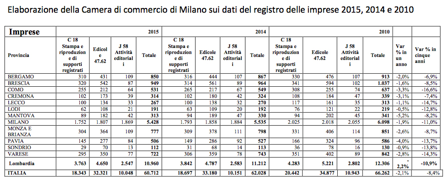 Le difficoltà dell’editoria in provincia di Cremona significano un calo del 7,4% delle imprese in cinque anni. Sono 11 mila le imprese lombarde nell’editoria su un totale italiano di 61 mila, tra centri di stampa, edicole e attività editoriali in genere. 42 mila gli addetti su 162 mila in Italia. Emerge da un’elaborazione della Camera di commercio di Milano sui dati del registro delle imprese 2015, 2014 e 2010.
