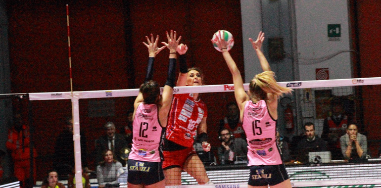 La squadra di casa riparte bene anche nel terzo set ma stavolta le avversarie non si fanno trovare impreparate e recuperano velocemente i punti di distacco, portandosi in pareggio sul 10-10. La Pomì non si lascia però intimorire e rimette la freccia, grazie ad una Fabris scatenata che mette a segno un punto dietro l’altro, supportata dalle incitazioni entusiastiche del tifo in rosa. Bergamo però dimostra grande maturità di gioco e con un bel lavoro di squadra recupera, tornando in pari con le rosa e tentando anche il sorpasso. Un finale di set da cardiopalma per la Pomì, ce prova in tutti i modi a contrastare la furia Bergamo, riuscendo a raggiungere le avversarie su 24-24 grazie a un importante punto di Stevanovic e ad un ace di Guerra. E’ Lloyd alla fine a chiudere il set, con un ace che sigla il 28-26 per Pomì.