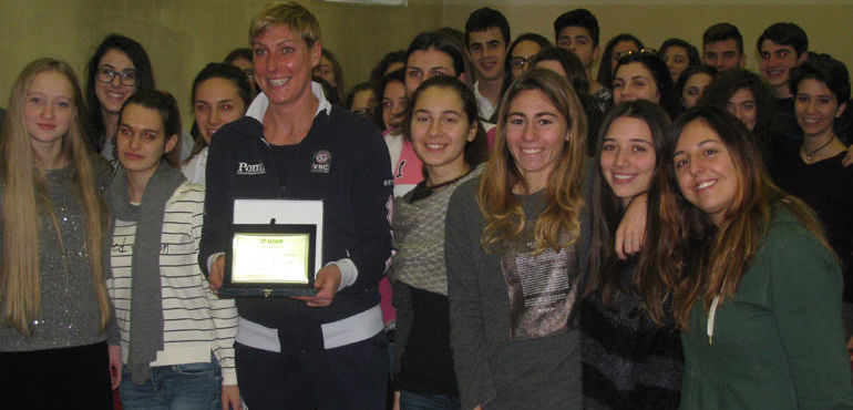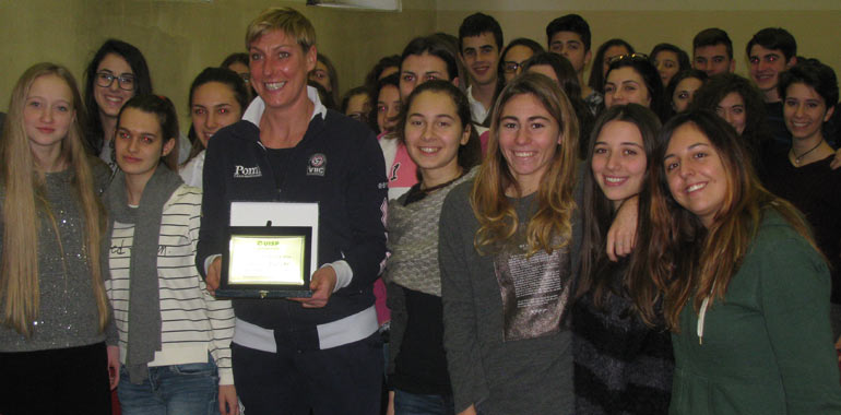 Bella cerimonia di consegna del “Premio Mimosa 2016” alla giocatrice della Pomì Casalmaggiore Lucia Bacchi, campionessa del volley nazionale ed internazionale, che questa mattina dalle mani del presidente provinciale Uisp Goffredo Iachetti ha ritirato la targa-ricordo del premio davanti ad una affollata platea nell’aula magna del liceo Manin. Coordinata da Pierluigi Torresani, la cerimonia ha visto la presenza anche del presidente della Pomì Massimo Boselli Botturi e dell’atleta canoista Marcello Caldonazzo, studente dell’istituto nonché sicura promessa del canottaggio cremonese, recente vincitore a Rotterdam dei Campionati Europei.