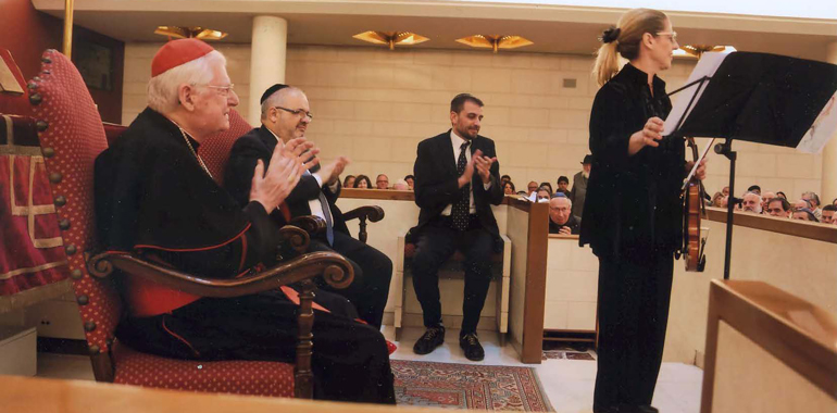 Per la prima volta come guida della Chiesa ambrosiana, l’Arcivescovo di Milano, il cardinale Ettore Scola, si è recato nella sinagoga centrale di Milano accolto dal Rabbino capo, rav Alfonso Arbib. Un incontro storico al quale hanno partecipato ebrei e cristiani e nel corso della quale la musicista Alessandra Romano, con il violino della Shoah, appartenente alla Collezione di strumenti storici di Carlo Alberto Carutti, “Le Stanze per la Musica” del Museo Civico “Ala Ponzone” di Cremona, ha eseguito il brano Nigun (Improvvisazione), dall’opera Baal Shem (che descrive la vita degli ebrei chassidici) di Ernst Bloch. Della delegazione della Diocesi facevano parte alcuni Vescovi ausiliari, rappresentanti del Consiglio delle Chiese Cristiane di Milano con l’attuale presidente, il pastore Platone, sacerdoti e partecipanti alla Commissione per l’Ecumenismo e il Dialogo della Diocesi, membri del Comitato scientifico dei “Dialoghi di Vita Buona”. Vi era poi l’intera dirigenza della Comunità ebraica di Milano, la seconda più numerosa in Italia, Yahya Pallavicini, presidente del Coreis (Comunità Religiosa Islamica Italiana), nonché molte autorità civili e militari.