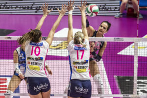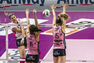Nel secondo set Novara cerca la riscossa e parte subito in quarta conquistando una serie di punti che le consentono di prendere le distanze. Una situazione non congeniale alle rosa, che sull’8-8 riescono a riportare il punteggio in parità. Nessuna delle due squadre vuole mollare e si gioca punto a punto, con una tensione in campo quasi palpabile. Sull’11-11 le piemontesi mettono di nuovo la freccia e le padrone di casa faticano un poi a contenere la foga delle avversarie, che riescono a mantenere il vantaggio e a prendere le distanze dalle rosa. Coach Caprara prova con qualche cambio tattico, facendo entrare anche Carmen Turlea. Le rosa riescono a colmare il divario recuperando alcuni punti sul 20-24, ma non basta e Novara chiude il set per 22-25.