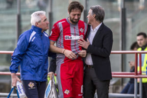 Al 13′ però sono i toscani ad andare in vantaggio con un gran tiro di Merkaj. Al 21′ esce per infortunio Stefano Lucchini, una brutta tegola per il difensore che lascia il campo in lacrime, al suo posto Canini. La Cremonese fatica a trovare gli spazi per pareggiare i conti. Al 36′ arriva un’occasione sui piedi di Maiorino ma Nocchi para a terra. Al 40′ Scarsella viene atterrato sulla trequarti, punizione ghiotta per la Cremonese. Batte Maiorino sulla barriera, Ferretti si avventa sul pallone e pareggia i conti. Il primo tempo termina 1-1