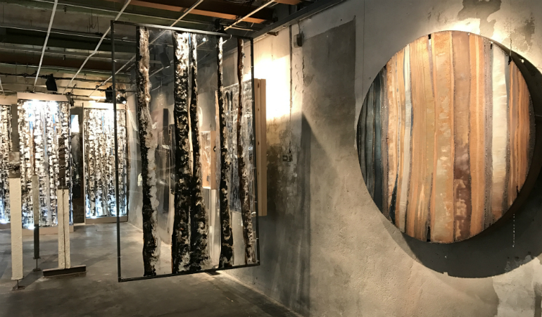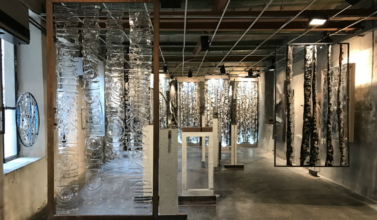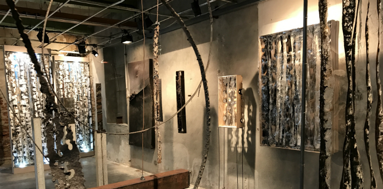 E’ come entrare in una foresta incantata, fatta però di materiali che ne evocano gli elementi, dagli alberi ai tronchi, alle acque che vi scorrono. Qui la luce sembra giocare a nascondino con le opere, fatte di policarbonato, vetro, ferro, stoffa e cemento, interpretazione filtrata dalla sensibilità dell’artista, di una natura che è la principale fonte di ispirazione.