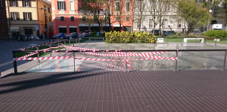 Piazza Marconi, transenne attorno ai lastroni di vetro rotti
